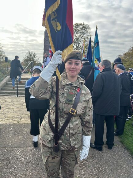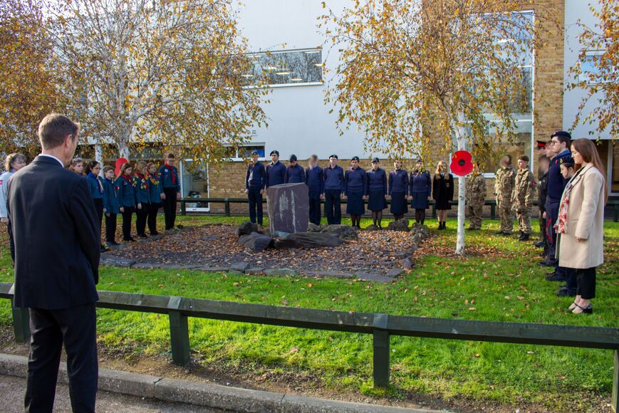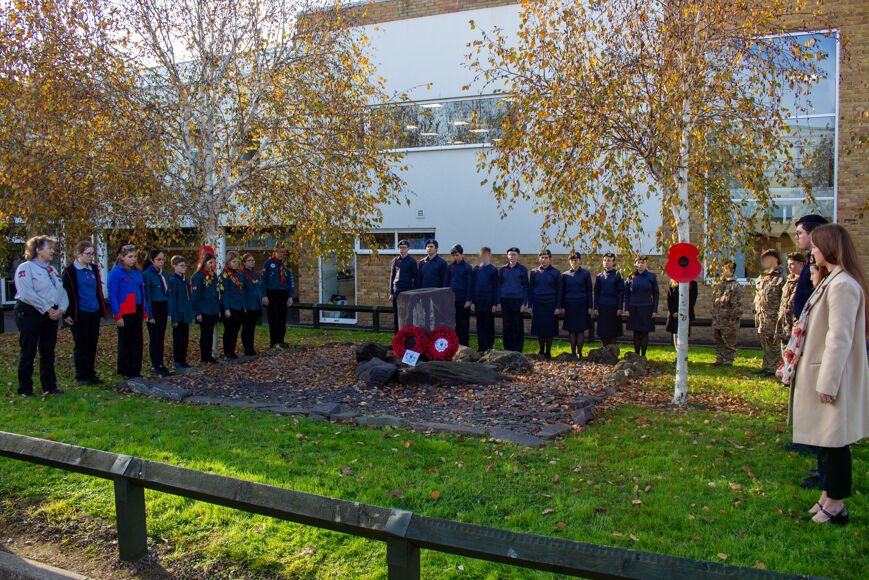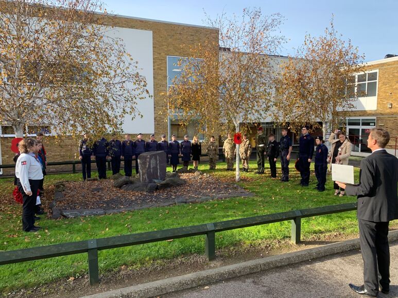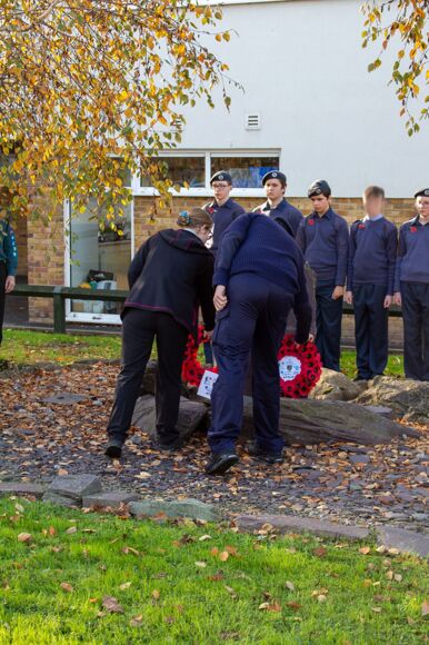 Those students who are members of uniformed groups, gathered at our memorial garden for the traditional wreath laying ceremony. They were joined by Mr Boyes; Mrs Hoare and Miss Claughton, who proudly wore her medals from serving with the Royal Corps of Signals along with other members of staff.